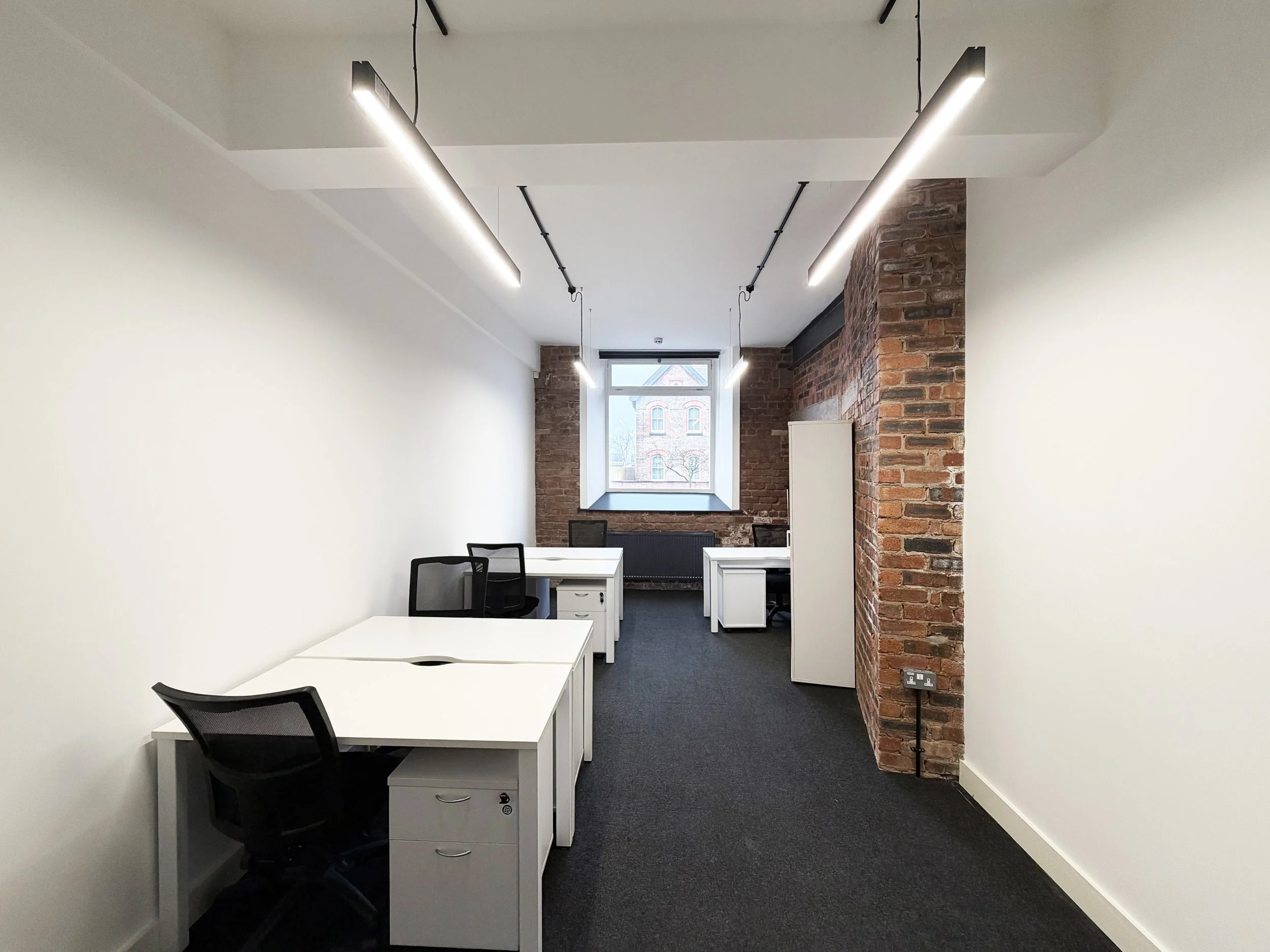 Offices range in design and finishes: from white insulated plaster walls to exposed brick work and open roof space suites. All offices have carpeted floors, gas central heating and modern lighting systems